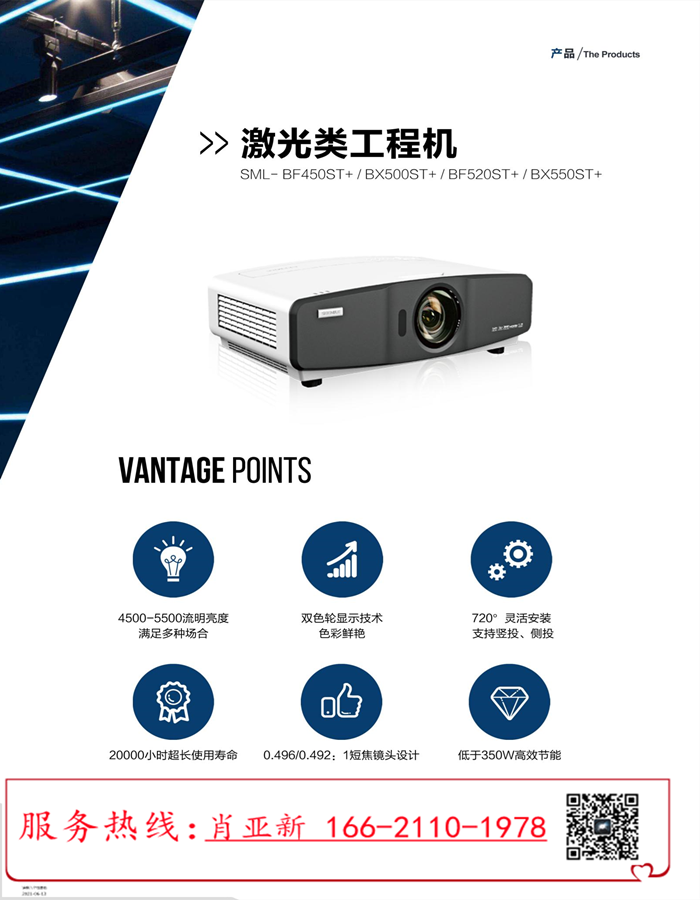 | [簡介]SML-BF550ST+/BX550ST+/BF550+一、技術參數(shù):1.芯片尺寸(0.65英寸)對角線(16:9寬高比)2.顯示方式DLP™芯片x1,DLP™3.物理分辨率1080P,1920x10804.亮度55005.動態(tài) |