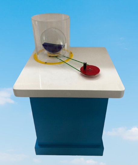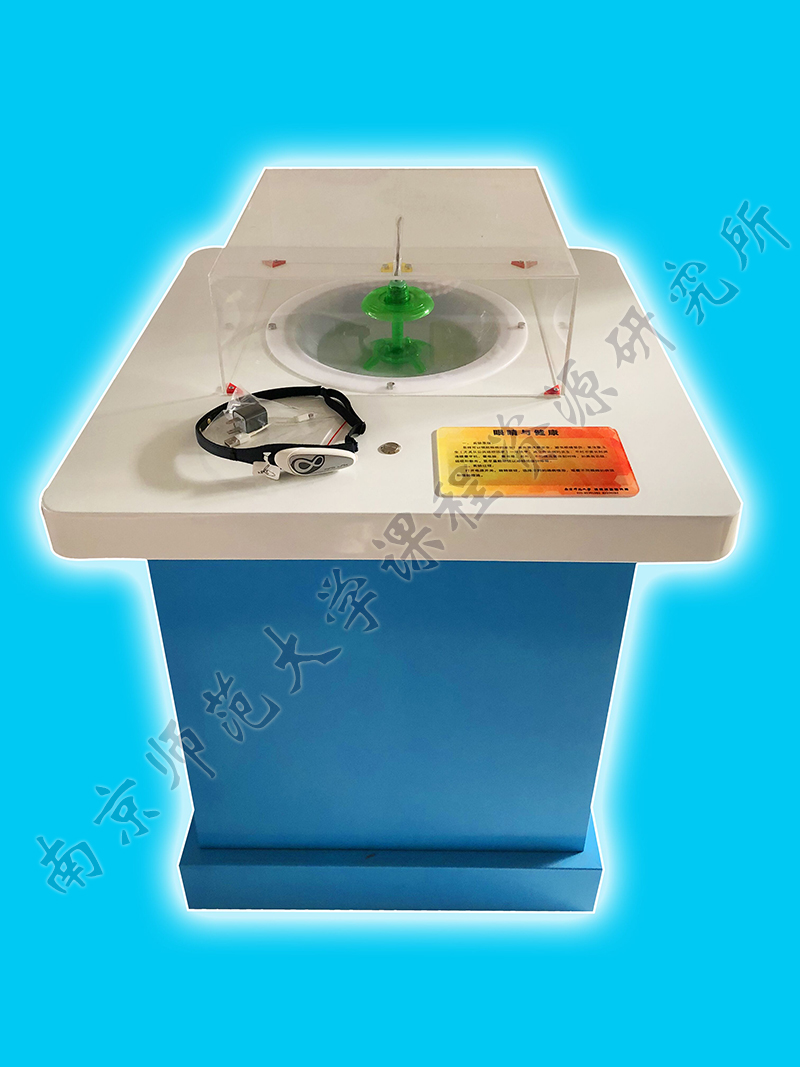 功能概述:此展項(xiàng)由可旋轉(zhuǎn)的轉(zhuǎn)臺(tái)、固定在旋轉(zhuǎn)臺(tái)上的演示裝置等構(gòu)成。通過互動(dòng)展示,讓觀眾了解離心現(xiàn)象。觀眾轉(zhuǎn)動(dòng)手輪驅(qū)動(dòng)轉(zhuǎn)盤轉(zhuǎn)動(dòng),可以發(fā)現(xiàn)由于離心力的作用,透明水箱中的液面發(fā)生了變化,中間低兩頭高。