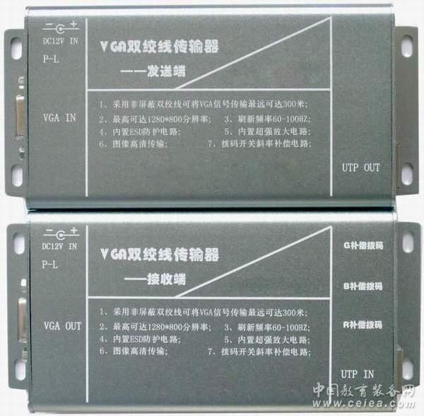 為了解決VGA信號(hào)+音頻信號(hào)較長(zhǎng)距離的傳輸時(shí),發(fā)生的圖像重影,顏色失真等問(wèn)題,北京麒麟視訊科技有限公司研發(fā)生產(chǎn)了這款雙絞線VGA傳輸器,可以傳輸距離為0--300米,是專為網(wǎng)絡(luò)平板顯示及大屏幕幕墻顯示廣告工程、工業(yè)自動(dòng)化控制、醫(yī)療設(shè)備、安防監(jiān)控、多媒體教學(xué)等顯示系統(tǒng)工程中高質(zhì)量VGA視頻信號(hào)長(zhǎng)距離傳輸?shù)男枨蠖鴮I(yè)設(shè)計(jì)的集VGA信號(hào)轉(zhuǎn)換、分配、驅(qū)動(dòng)、接收和還原功能為一身的信號(hào)傳輸系統(tǒng)。它可以將VGA信號(hào)通過(guò)非屏蔽五類網(wǎng)線上平衡傳輸,以增強(qiáng)對(duì)共模噪聲及干擾信號(hào)的抑制,同時(shí)大幅度地節(jié)約線材成本并簡(jiǎn)化了工程布線。采用專利技術(shù)將H和V信號(hào)編碼至RGB信號(hào)上加重處理后發(fā)送,僅利用CAT-5電纜的三對(duì)雙絞線完成VGA、SVGA、SXGA、XGA、SXGA的RGBHV信號(hào)的平衡編解碼,并采用遠(yuǎn)距離高頻補(bǔ)償加重處理,帶寬高達(dá)350MHz。使XGA(最高1600*900/60Hz)的傳輸距離達(dá)到300米,以滿足大型工程投影機(jī)、顯示器、TFT-LCD TV、PDP信號(hào)傳輸?shù)男枰S捎谡麄(gè)傳輸系統(tǒng)采用了加權(quán)零值拆分的平衡傳輸?shù)膶@夹g(shù),因此雙絞線在傳輸信號(hào)時(shí)不會(huì)對(duì)外造成EMI的干擾。可通過(guò)設(shè)置撥碼開(kāi)關(guān)來(lái)調(diào)整傳輸距離的遠(yuǎn)近。