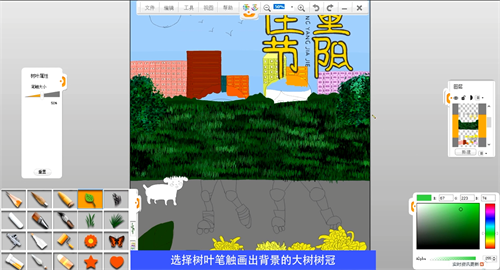 選擇小草筆觸畫出背景的草地,選擇樹葉筆觸畫出背景的大樹樹冠