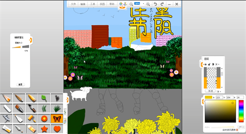 選擇毛筆筆觸畫出前景的植物,選擇毛筆筆觸用黃色和白色畫出花朵