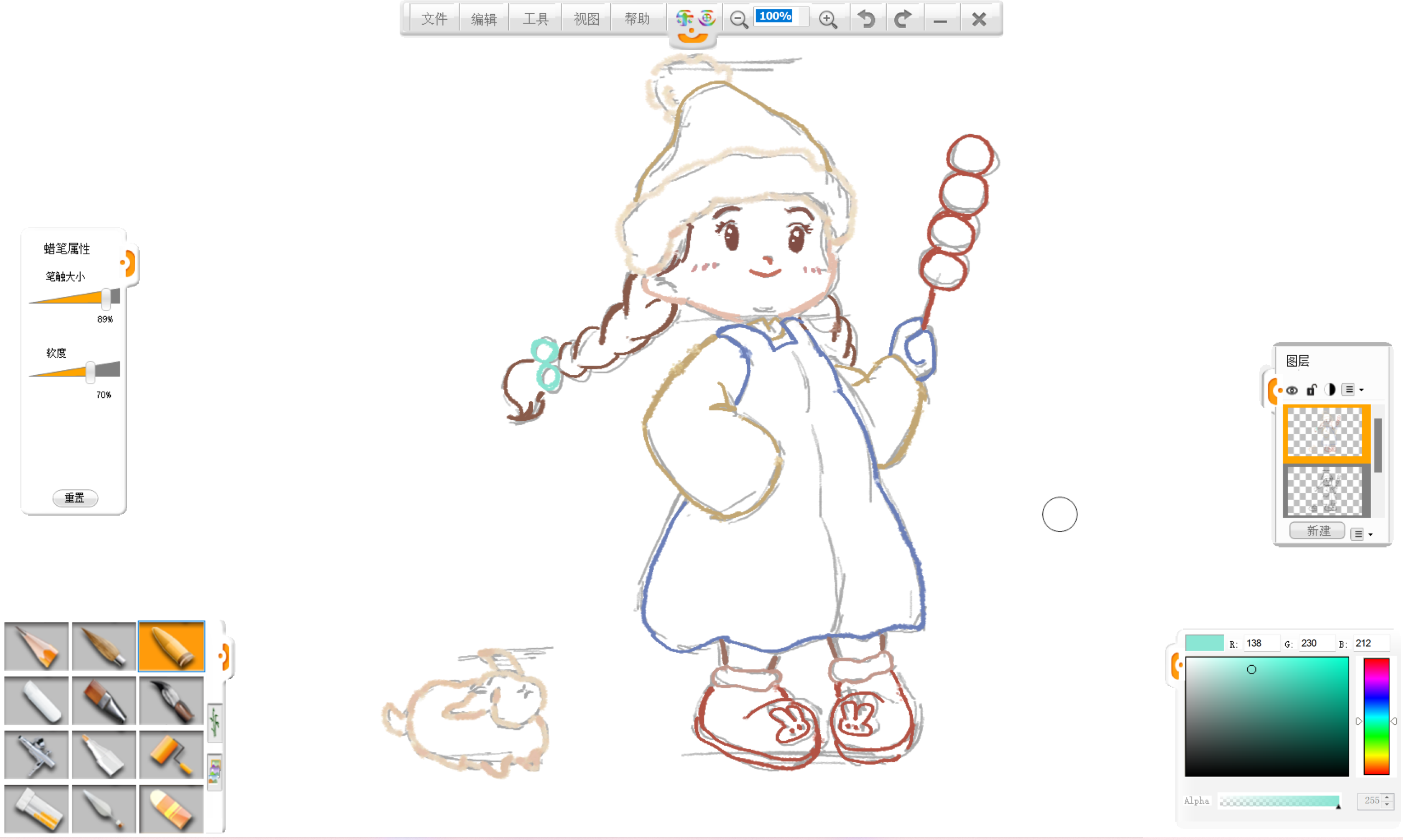 8. 新建圖層,位于勾線圖層下方,用蠟筆工具填充喜歡的顏色。