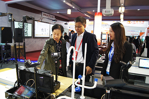 陜西省教育廳教育技術(shù)裝備管理中心主任趙夢(左)蒞臨廣視通展位參觀指導(dǎo)