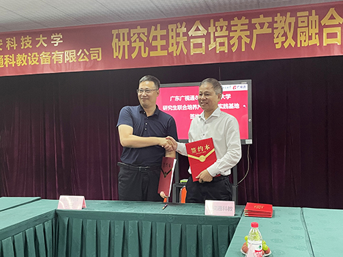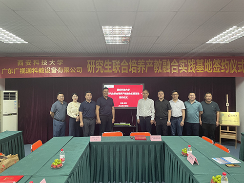 2023年7月8日下午,廣東廣視通科教設(shè)備有限公司與西安科技大學(xué)“研究生聯(lián)合培養(yǎng)產(chǎn)教融合實(shí)踐基地”簽約儀式在廣視通大廈二樓會(huì)議室舉行。西安科技大學(xué)管理學(xué)院副院長鄒紹輝,西安科技大學(xué)大灣區(qū)研究生聯(lián)合培養(yǎng)產(chǎn)教融合實(shí)踐基地導(dǎo)師羅立升,西安科技大學(xué)大灣區(qū)MBA校友會(huì)籌備組秘書長、東莞市市場監(jiān)督管理局石排分局同仲強(qiáng),大灣區(qū)西安科技大學(xué)MBA校友會(huì)籌備組委員陳桂;特邀嘉賓廣東科技學(xué)院黨委副書記、副校長畢會(huì)東,東莞市名校研究生培育發(fā)展中心林洪嘉;公司董事長陳登貴、副總經(jīng)理吳斌華、副總經(jīng)理潘富兵等出席簽約儀式。由西安科技大學(xué)大灣區(qū)研究生聯(lián)合培養(yǎng)產(chǎn)教融合實(shí)踐基地導(dǎo)師羅立升主持簽約活動(dòng)。