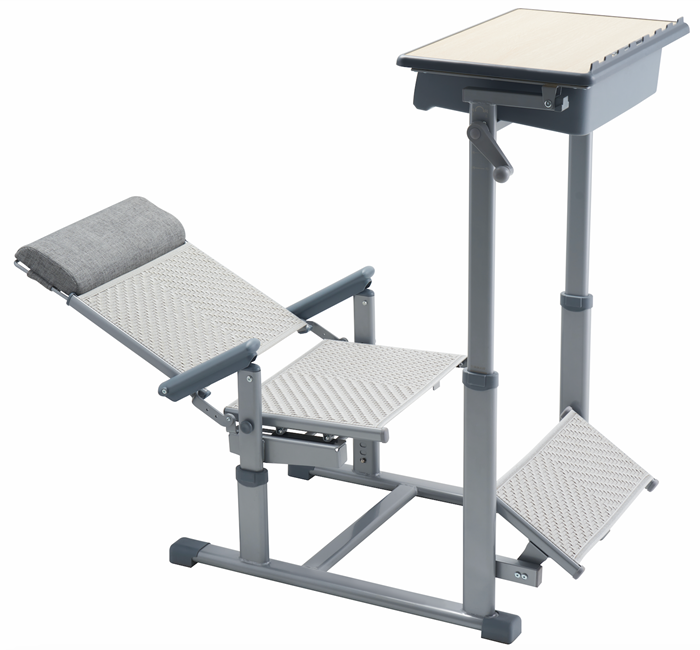 7、課桌椅午休模式:課桌通過單側(cè)手搖桿升高到午休高度,課椅靠背后仰,并打開PE藤質(zhì)擱腳板,借助桌下和椅下空間,可在0.88米前后間距實現(xiàn)150度原位舒適躺休。