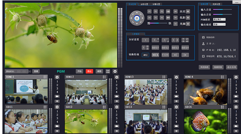 大屏輸出 通過 HDMI 接口輸出 PGM 合成通道的全屏視頻顯示,支持單畫面、多畫面分割顯示 1/2/3/4 分屏顯示�?深A設分屏模式位置圖像大小功能。 界面輸出 支持硬件 HDMI 接口輸出系統操控界面,方便本地實時操控。