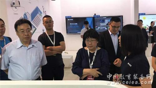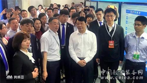 圖十一:湖南省教育廳副廳長應若平(圖右二),湖南省教育廳基教處處長楊玲(圖右一) 參觀奧威亞與中國電信安徽教育信息化項目互動展示區