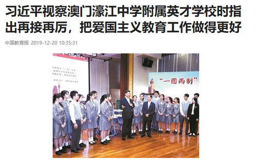 2019年12月,正值澳門回歸20載,國家領(lǐng)導(dǎo)人成批帶隊(duì)深入澳門地區(qū),視察當(dāng)?shù)囟嗨^(qū),其中濠江中學(xué)更是重點(diǎn)校區(qū)之一。