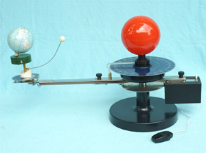 4、日食和月食: 演示時(shí),使月球處于地球和太陽之間,再調(diào)整月球軌道圈,使月、地、日三者成一直線,月球的影子投射在球上,便發(fā)生日食。如地球處于月球與太陽中間,月球進(jìn)入地形,便產(chǎn)生月食。