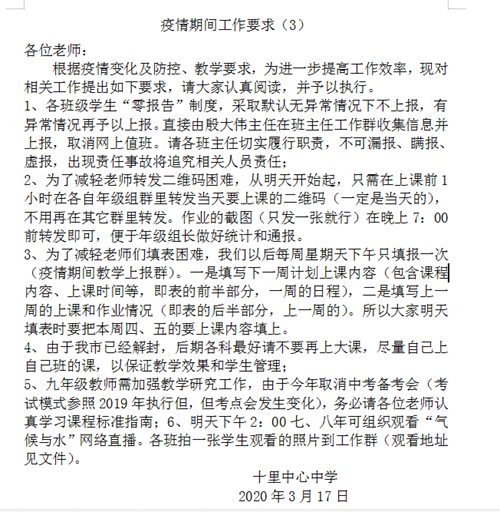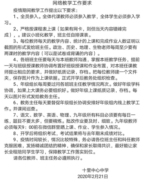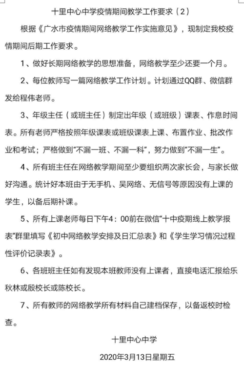 廣水市十里街道辦事處中心中學(xué)在校長(zhǎng)陳江濤的總體部署下,通過對(duì)教師、家長(zhǎng)、學(xué)生調(diào)研,積極解決網(wǎng)絡(luò)教學(xué)存在的硬軟件問題,制定健全的線上教學(xué)方案,穩(wěn)定推動(dòng)網(wǎng)絡(luò)教學(xué)的進(jìn)行。
