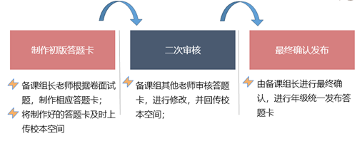 二:答題卡制作——為確保答題卡制作的準(zhǔn)確性,學(xué)校總結(jié)了一套“制作-核對(duì)-修改布置”的模式,由各學(xué)科組長(zhǎng)準(zhǔn)備月考試卷,并上傳至希沃易課堂,制成初版答題卡后,分享到校本空間;隨后由本學(xué)科其他教師進(jìn)行查看、核對(duì),如果有異常可以進(jìn)行二次修改并回傳校本空間;最后由備課組長(zhǎng)進(jìn)行終版修改,核對(duì)無誤后,統(tǒng)一布置。群策群力,讓每一位老師都有參與感,發(fā)揮集體力量。