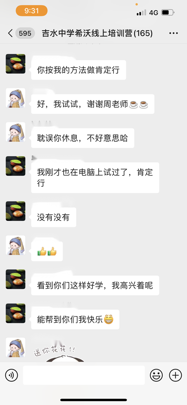 在正式培訓(xùn)中,教師們興趣盎然地進(jìn)行著學(xué)習(xí),時常在學(xué)習(xí)群里互相交流、分享學(xué)習(xí)心得與軟件操作技術(shù)經(jīng)驗。吉水中學(xué)與希沃講師團(tuán)隊還共同組建了網(wǎng)絡(luò)教學(xué)微信服務(wù)群,并邀請經(jīng)驗豐富的教學(xué)名師們在群里為參訓(xùn)教師答疑解惑。當(dāng)參訓(xùn)教師們遇到實踐問題或疑難點(diǎn)時,大家都會積極提問、互相交流、耐心探討。在教師們來回討論之間,這場培訓(xùn)活動的學(xué)習(xí)氛圍愈發(fā)濃厚。