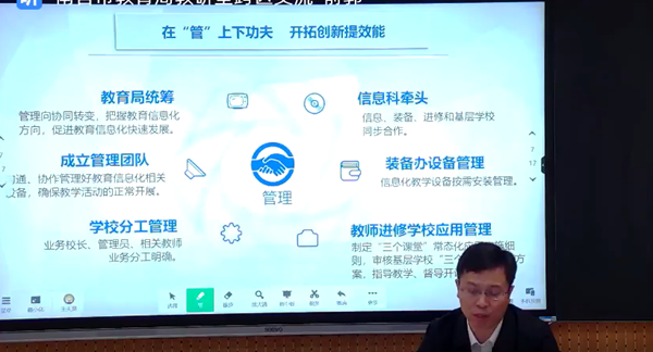前郭縣王天昊主任從區(qū)域情況、方案設(shè)計、建管培用、取得成績四個方面介紹了前郭縣三個課堂的建設(shè)情況,指出“三個課堂”實現(xiàn)常態(tài)化應(yīng)用一方面需要城鄉(xiāng)一體化的硬件建設(shè),還需要在教師培訓(xùn)上多下功夫,同時要明確各部門職責(zé)分工并制定考核評價體系。
