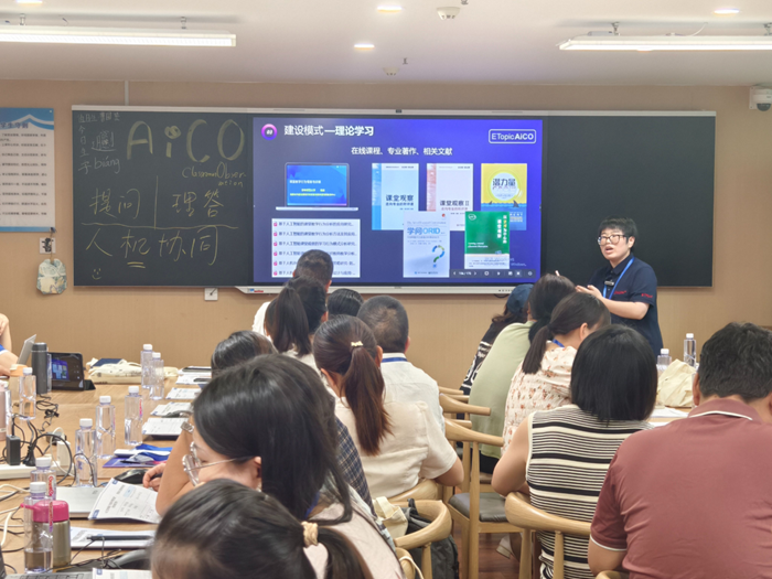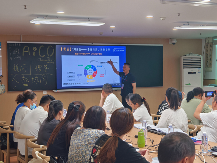 ETopic湘機(jī)中學(xué)工作站站長(zhǎng)曹圓龑與參訓(xùn)教師深度分享了如何開(kāi)展AiCO主題校本研修和社群建設(shè)。她介紹,以“人工智能課堂觀察”為主題設(shè)計(jì)、實(shí)踐協(xié)作性活動(dòng),能夠幫助探索促使學(xué)生學(xué)習(xí)改善、教師個(gè)人成長(zhǎng)、教研團(tuán)隊(duì)發(fā)展、學(xué)校教育提升的可行路徑。