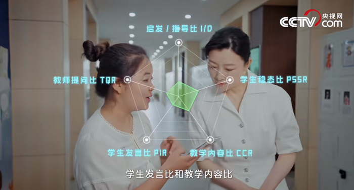 “我好像有了一個專職的‘輔導員’,幫我一對一地進行指導磨課。”人大附中豐臺學校三年級的數學老師于鑫岳輕觸手機,展示道:“這份課堂報告能詳細記錄下我的每一次提問。通過這個記錄,我會進行課堂問題互動的優化。另外,這里還有一個五邊形的圖樣,這是基于弗蘭德斯互動分析圖對我的課堂情況進行數據分析,包括了啟發、指導比、教師提問比、學生發言比、教學內容比及學生穩態比,能夠充分呈現師生課堂互動的過程。”