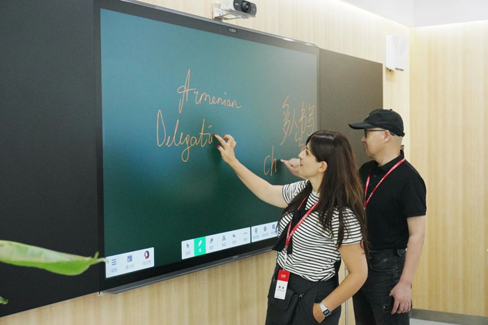 在視源股份蘇州產業園,視源股份海外事業群客戶總監何銀吉向參觀人員詳細介紹了公司的整體業務和發展情況。隨后,希沃江蘇子公司客戶顧問張文秀及其他同事,共同帶領參觀者體驗了希沃智慧黑板和交互智能平板。這些設備不僅能播放電子課件,而且主屏幕以及兩側的副屏幕都可用于書寫,滿足了教師日常上課的板書需求。其中,板書書寫功能和希沃白板的立體幾何工具贏得了參觀者的一致好評,使他們切實感受到了中國教育信息化實際應用成果。