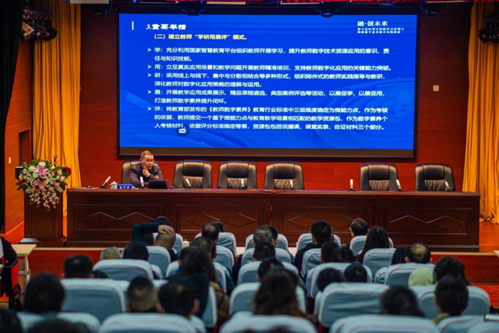 12月5日至6日,“國培計劃(2023)”湖南省市縣能力提升工程管理者高研班暨教師數字素養提升項目現場會在長沙市望城區中小學教師發展中心舉行。開班儀式由湖南省中小學教師發展中心副主任曾建軍主持。之后由分別由望城區教育局局長戴金利、湖南省教育廳教師工作與師范教育處三級調研員楊金紅致辭發言。在培訓環節,華東師范大學教師發展學院院長、全國中小學教師培訓專家工作組副組長、全國中小學教師信息技術應用能力提升工程辦副主任閆寒冰教授帶來了專題講座《數字化環境下的育人模式變革》。閆寒冰通過生動的案例和深入的剖析,闡述了數字化環境對教育教學模式的深刻影響,以及教師如何提升自身數字素養以適應這一變革,讓教師們深刻認識到生成式人工智能在教育教學中的無限可能。