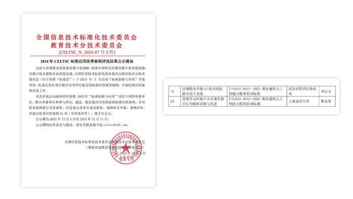 近日,全國信息技術(shù)標(biāo)準(zhǔn)化技術(shù)委員會(huì)教育技術(shù)分技術(shù)委員會(huì)暨教育部教育信息化技術(shù)標(biāo)準(zhǔn)委員會(huì)(以下簡稱“標(biāo)委會(huì)”)于海南省三亞市召開了“2024下半年全體會(huì)議暨教育信息化技術(shù)標(biāo)準(zhǔn)研討會(huì)”,公布了2024年CELTSC標(biāo)準(zhǔn)應(yīng)用優(yōu)秀案例評選結(jié)果。由廣州視睿電子科技有限公司(希沃)技術(shù)支持的兩個(gè)案例入選,分別是沈陽市鐵西區(qū)教育局的《區(qū)域教育升級AI技術(shù)的創(chuàng)新應(yīng)用于實(shí)踐》、上海市長寧區(qū)適存小學(xué)的《智慧學(xué)習(xí)環(huán)境下小學(xué)課堂教學(xué)行為精準(zhǔn)識別與改進(jìn)》。