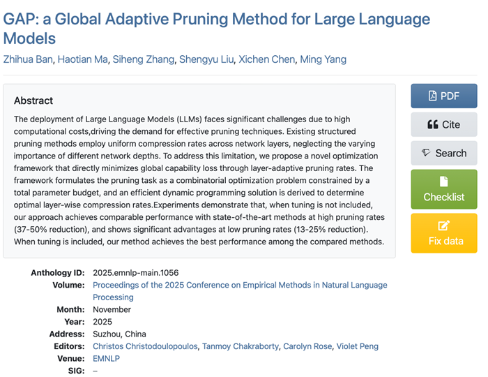 視源AI團隊的研究成果基于大模型不同模塊對精度影響存在差異的觀察,提出一種自適應(yīng)的剪枝方法,該方法將剪枝問題轉(zhuǎn)換成一個組合優(yōu)化問題,并通過嚴謹?shù)臄?shù)學(xué)推導(dǎo)將求解的時間復(fù)雜度從指數(shù)級化簡為多項式級。經(jīng)試驗驗證,該方法不僅在非微調(diào)方法中獲得較好的效果,在微調(diào)方法中也超越了當(dāng)前的先進水平。相關(guān)技術(shù)論文已被頂會EMNLP主會接受,獲得了國際學(xué)術(shù)界對該方法的認可。