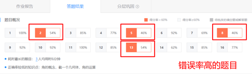 作業報告可以幫助我們了解整體情況,而答題結果則是幫我們聚焦細節問題。首先,在答題結果中,得分率低于60%的題目系統會自動進行標紅,這些題目可以判定為學生錯的最多的題目,老師可以重點講解這些題目,并補充相應的學習資源,彌補這一學習漏洞。