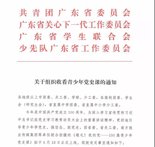 近日,共青團廣東省委員會、廣東省關心下一代工作委員會、廣東省學生聯合會、少先隊廣東省工作委員會聯合發布《關于組織收看青少年黨史課的通知》,希望各地單位充分運用《敬禮!我的黨——100集青少年黨史課》資源,通過自學、集中學等形式積極開展青少年交流實踐活動。同時,該通知的附件提供了清晰的青少年黨史課觀看指南,其建議有條件的學校可以組織學生通過希沃云屏線下觀看。