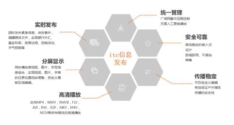 目前,itc信息發布系統廣泛應用于傳媒、銀行、電力、交通、醫院、酒店、學校、政府等各領域。除常規功能外,系統可擴展性強,通過定制可滿足各種復雜信息發布需求,如數據對接、觸摸查詢、辦公應用等等。較為周全的安全措施,也為其實際應用提供了很好的安全環境。