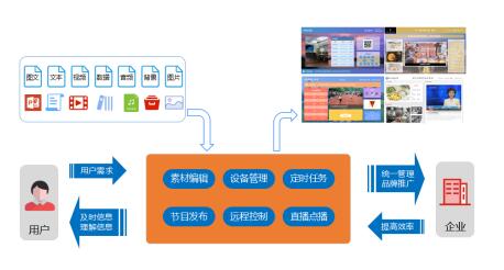 目前,仍有大部分企業宣傳基于展架、海報等方式,內容單一,手動置換耗時耗力,存在著時效性差、不環保等一系列問題,品牌形象得不到推廣;而通用的信息發布則多以零散分布的電子顯示為主,終端設備管理和維護難度大,產品使用壽命較短。