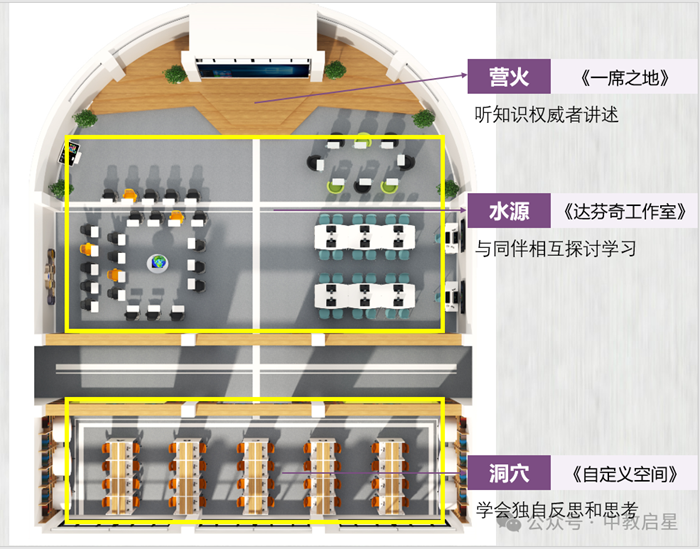 該空間的設(shè)計(jì)理念是引入國際著名的教育學(xué)家、未來學(xué)家戴維• 索恩伯格的學(xué)習(xí)場景理念,在他的著作《學(xué)習(xí)場景的革命》中,將四種主要的學(xué)習(xí)模式進(jìn)行了形象的比喻:營火、水源、洞穴、生活。