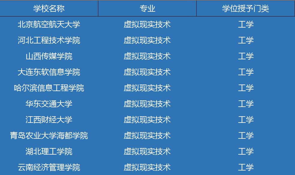 在公布的2020年度普通高等學校本科專業備案和審批結果中,有十所高校獲批開設“虛擬現實技術”專業。獲批“虛擬現實技術”本科專業院校名單如下: