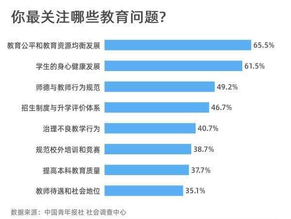 其中大家最關注的教育問題是教育公平和教育資源均衡發展(65.5%),其次是學生的身心健康發展(61.5%)。