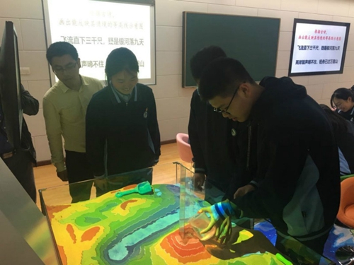 在上海師范大學附屬中學的數(shù)字化地理專用教室,一堂別開生面的地理課《等高線地形圖的判讀》正在進行。課上,趙禧琳老師請每個小組派出代表來到AR沙盤前,根據(jù)“飛流直下三千尺,疑是銀河落九天”“兩岸猿聲啼不住,輕舟已過萬重山”兩句古詩的情境,在沙盤上制作景觀模型。這個趣味任務(wù)一下子點燃了學生的熱情,學生在沙盤前討論、動手,在“玩”中探究二維等高線地形圖與三維地貌模型的關(guān)系。