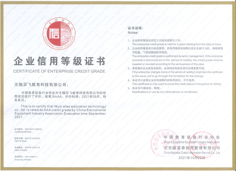 無錫羿飛教育科技有限公司自成立以來陸續(xù)取得多項榮譽資質:江蘇省民營科技企業(yè)、高新技術企業(yè)、科技創(chuàng)新先進企業(yè)、江蘇省科普產(chǎn)業(yè)研發(fā)基地等。并已擁有近百項專利技術、注冊商標和軟件著作權。作為國內先進教育裝備提供商,一直以來都是中國教育裝備行業(yè)協(xié)會的優(yōu)秀會員。羿飛教育不斷開拓創(chuàng)新,以技術為先導,以產(chǎn)品為平臺,以應用為核心,以服務為保障,企業(yè)AAA信用等級是對羿飛教育的認可與肯定。