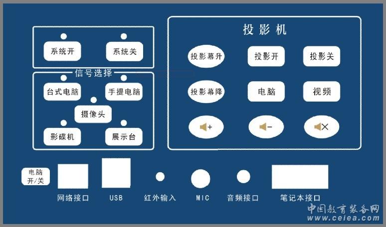 產(chǎn)品詳細(xì)介紹★1、多媒體一體中控主要特點(diǎn):4×2VGA切換,3*3視頻矩陣;有單獨(dú)電腦開關(guān)按鍵;前控制面板帶網(wǎng)絡(luò)接口、2路USB接口、話筒接口、筆記本電腦音頻、筆記本VGA口;,可擴(kuò)展為網(wǎng)絡(luò)中控; ★2、視頻矩陣:內(nèi)置4×2VGA切換分配器,分辨率可測能達(dá)到1920*1080,帶400MHZ長線驅(qū)動器,支持臺式電腦、手提電腦、數(shù)字展臺、數(shù)字DVD輸入; 3、音頻矩陣:內(nèi)置3路音頻輸入,1路輸出; ★4、視頻矩陣:內(nèi)置3路視頻輸入,3路輸出 5、控制功能:內(nèi)嵌式紅外學(xué)習(xí)功能,支持電腦軟件操作、面板操作、全功能紅外遙控器操作; 6、RS-232控制接口:1路可編程RS-232控制接口,可用RS-232控制投影機(jī); 7、音量控制:內(nèi)置1路高保真無級音量調(diào)節(jié); 8、紅外發(fā)射接口:1路紅外發(fā)射接口,可紅外自學(xué)習(xí)控制投影機(jī); 8、I/O控制接口:2路I/O控制接口,具有投影機(jī)防盜功能,并可連接門磁開關(guān)、實(shí)現(xiàn)連鎖控制; 9、電源保護(hù):自動延時(shí)投影機(jī)電源保護(hù)器,檢測投影機(jī)燈泡的工作情況,并且自動延時(shí)斷電; ★10、電源管理:強(qiáng)弱電分體設(shè)計(jì),系統(tǒng)更安全。二路強(qiáng)電控制管理:一路屏幕升降,一路投影電源;采用專業(yè)電源,輸入12V/2A,性能更穩(wěn)定; ★11、即插即用:內(nèi)置超過60種投影232碼,簡單撥位設(shè)置即可使用。免調(diào)試功能多種開機(jī)方式和信源自定義,音量自動記憶功能。 ★12、1路MIC輸入,方便用戶講解; 13、中控開孔尺寸:188mm×110mm;中控外觀尺寸:215*125*125mm |