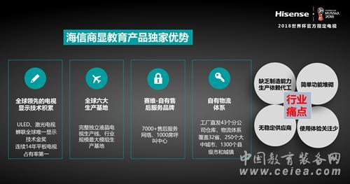 同時,海信商用顯示股份有限公司總經理胡劍涌在發言中介紹到,面對教育產品新藍海,海信擁有獨家優勢:其擁有49年全球領先的電視顯示技術積累,業內完整獨立的液晶模組生產線,集研產銷于一體;不僅如此,海信旗下擁有自有售后服務公司、海信自有的物流網絡覆蓋全國,在未來激烈的市場競爭中,這些優勢都將成為海信的王牌。