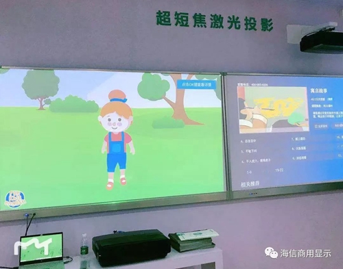 本次展會,海信一并重磅推出了教育專用的超短焦激光投影。采用行業頂尖高清顯示技術,保證任何畫面高保真輸出。激光主機采用超靜音低功耗設計,有效保證了教室的安靜的教學環境。不僅如此,海信教育超短焦激光投影搭載豐富的微課學習資源,豐富學生的互動教學體驗。