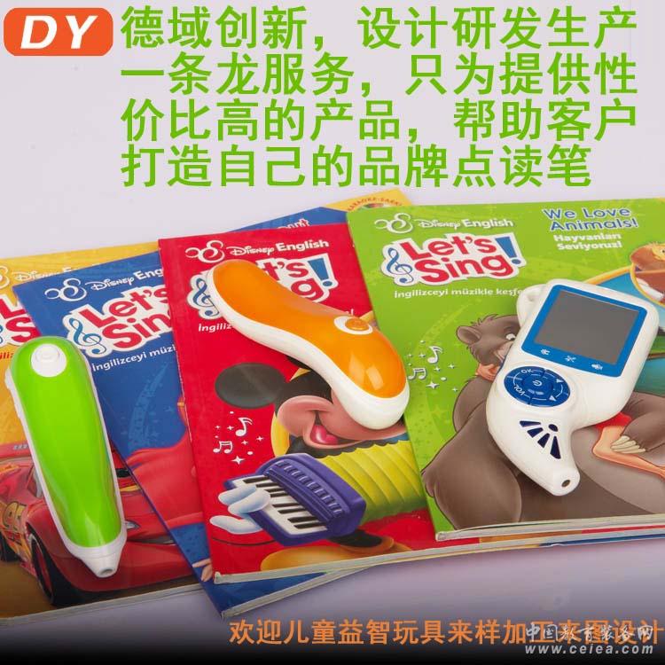 產(chǎn)品詳細(xì)介紹點讀筆定制方案,專業(yè)點讀筆廠家提供 德域公司于2011年成功推出了點讀筆系列方案,屬于國內(nèi)最早一批專注投入研發(fā)點讀筆方案的公司,為客戶提供點讀筆專業(yè)研發(fā)、有聲圖書編錄、外殼開模注塑、OEM\ODM、方案選擇。 目前市面上有用到松翰、凌陽、KB、格萊、美哲、安凱、瑞芯微等方案,松翰方案是應(yīng)用最多最穩(wěn)定的方案之一。我們可以根據(jù)客戶具體需求訂制,有效控制成本提供好的價格與技術(shù)支持, 目前是行業(yè)公認(rèn)最專業(yè)、最有竟?fàn)幜Φ膹S家之一。 2015年德域與臺灣點讀方案公司松翰達(dá)成戰(zhàn)略合作關(guān)系共同研發(fā)新一代點讀芯片組,開放研究實驗室與點讀方案共同協(xié)作研發(fā),同時擴(kuò)大生產(chǎn)規(guī)模,創(chuàng)建目前國內(nèi)最大的點讀筆OEM生產(chǎn)基地(7000平方米)。 首先看看點讀筆能用在哪些地方。 點讀筆常見應(yīng)用如下: 1)幼兒早教類:幼兒圖書、幼兒地墊、幼兒掛圖、故事機(jī)、有聲成長日記、有聲相冊、DIY錄音 2)學(xué)生學(xué)習(xí)類:教材、有聲詞典、有聲詞典卡、單詞卡片、有聲課堂記錄本 3)成人類:多國學(xué)習(xí)教材、旅游手冊、有聲記錄本,語音點讀地球儀,古蘭經(jīng),佛學(xué)點讀,中醫(yī)穴位點讀等 4)特殊應(yīng)用:身份識別系統(tǒng)、防偽、有聲地圖、盲人學(xué)習(xí)、視頻教學(xué)、人機(jī)互動學(xué)習(xí)、聲控儀