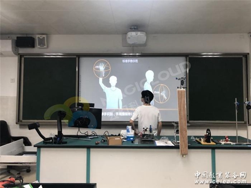 云幻科教為其提供AR實(shí)踐探究實(shí)驗(yàn)室解決方案,綜合應(yīng)用AI和AR技術(shù),通過(guò)3D建模虛擬再現(xiàn)真實(shí)的實(shí)驗(yàn)場(chǎng)景,借助先進(jìn)的體感交互設(shè)備Kinect進(jìn)行虛實(shí)互動(dòng),將真實(shí)的老師與虛擬仿真的實(shí)驗(yàn)器材結(jié)合到一個(gè)畫面里,老師實(shí)現(xiàn)無(wú)需佩戴任何體感設(shè)備,純手勢(shì)就可以進(jìn)行實(shí)驗(yàn)互動(dòng)教學(xué)。虛擬仿真的教學(xué)模式為紅嶺中學(xué)石廈初中部帶來(lái)智能化的教學(xué)體驗(yàn)。