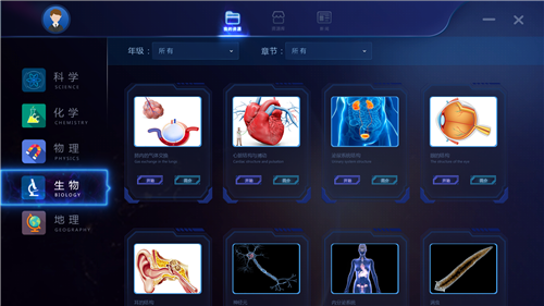 云幻科教根據教育現狀,針對于小學教育、初中教育、高中教育的不同需求,研發建設與各學科相配套的3D互動教學資源庫,設置演示、交互、練習三大部分。3D互動教學資源庫包括科學、化學、數學、物理、生物、地理等學科資源,為老師提供前沿、創新、有效的教學輔助資料,為學生營造身臨其境的沉浸式學習氛圍。