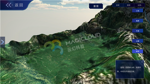 云幻科教AR地理仿真實驗資源制作等高線的地形模型,使用不同顏色標注不同海拔的等高線,便于學生理解等高線地形圖的繪制原理,通過不同的地形模型,引導學生認識各種地表形態的名稱、特點,輕松學習地理知識。