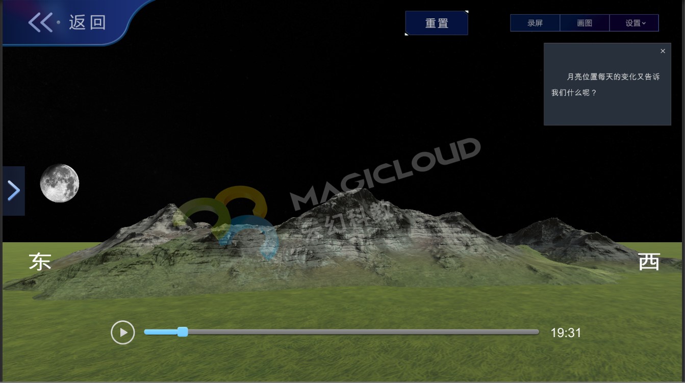 在教學過程中,不僅僅是要學生學得月相變化的知識內容,更是幫助學生完成科學概念的建構,培養學生良好的科學思維和科學態度。云幻科教VR仿真實驗平臺從課本教材出發,提供專業、全面的教學內容,引導學生對物質世界有更深刻的認識,同時對教學內容進行擴充,將科學知識與生活場景關聯,讓學生能夠用所學的知識解釋生活中的有關現象、解決有關實際的問題,引導學生在已知內容基礎上進行再創新與再創造。