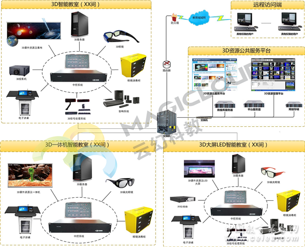 3D資源公共服務平臺解決方案,采用B/S架構,“云+端”模式,搭配3D優質教學資源庫,以校園網或教育網為基礎,建立可共享的優質數字教育資源環境,為區域內所有多媒體教室提供教育資源信息服務,實現優質資源校校通、班班通、人人通。此方案配合3D智能教室解決方案、3D校園安全教育解決方案一并應用,能實現統一管理、優化配置、節省經費的效果。