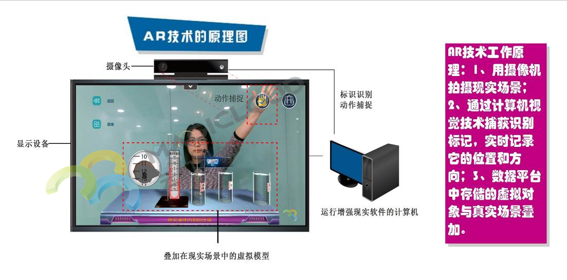 AR實驗智能評測系統以AR技術為基礎,結合先進的體感交互設備,將真實世界信息與虛擬世界信息進行“無縫”對接,借助顯示設備將現實世界的一定時間空間范圍內很難體驗到的實體信息通過科學技術模擬仿真后在疊加,使虛擬對象與真實環境融為一體,并呈現給使用者一個感官效果真實的新環境,具有虛實結合、實時交互、三維注冊特點。該平臺虛擬再現真實的實驗,真實再現實驗過程、實驗結果、實驗數據、實驗操作,從而達到虛擬教學、練習的目的。