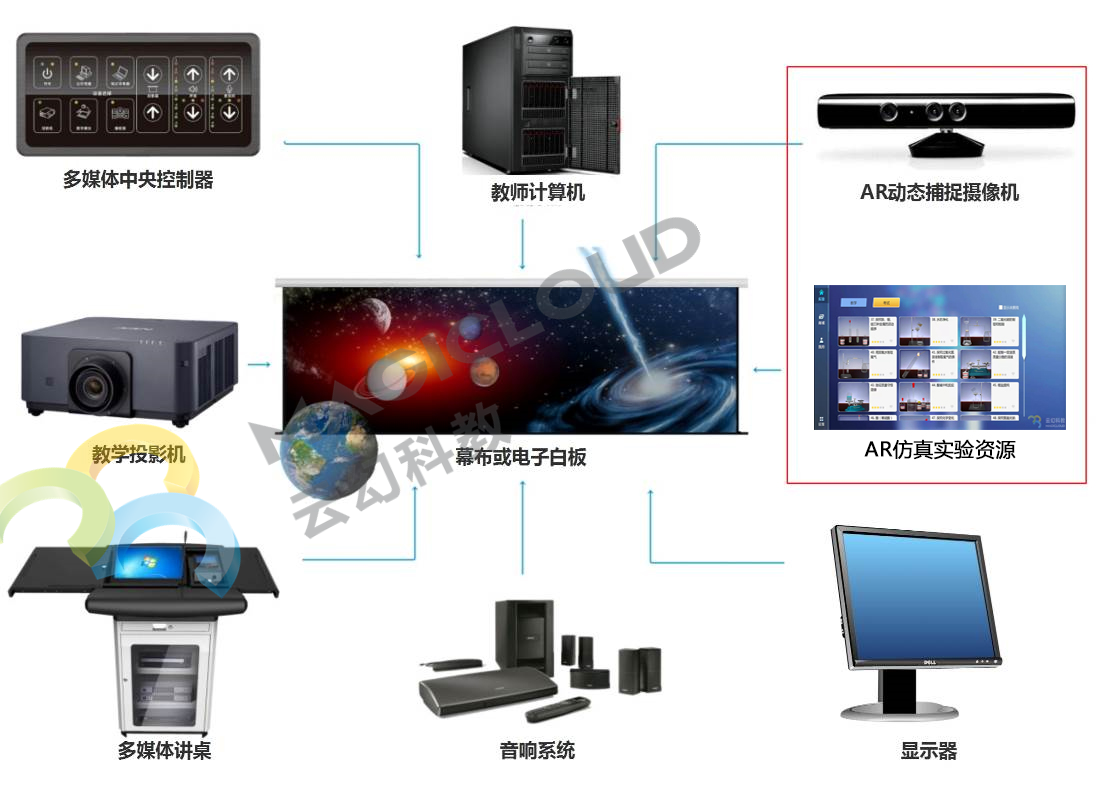 因此,實驗平臺系統的搭建非常便利,需要做的只是選擇一間常規多媒體教室或功能教室(教學場地),現有教學設施(或新建)包括一臺亮度適中的投影機、幕布或電子白板、教師計算機、電子講桌、音響等(多媒體設備),也可以是一臺集成度更好、性價比更高的多媒體教學觸控一體機、推拉組合黑板等,然后增加一臺體感追蹤攝像機、伸縮式支架、AR仿真實驗考試資源及軟件,從而實現多媒體教室的平滑升級。