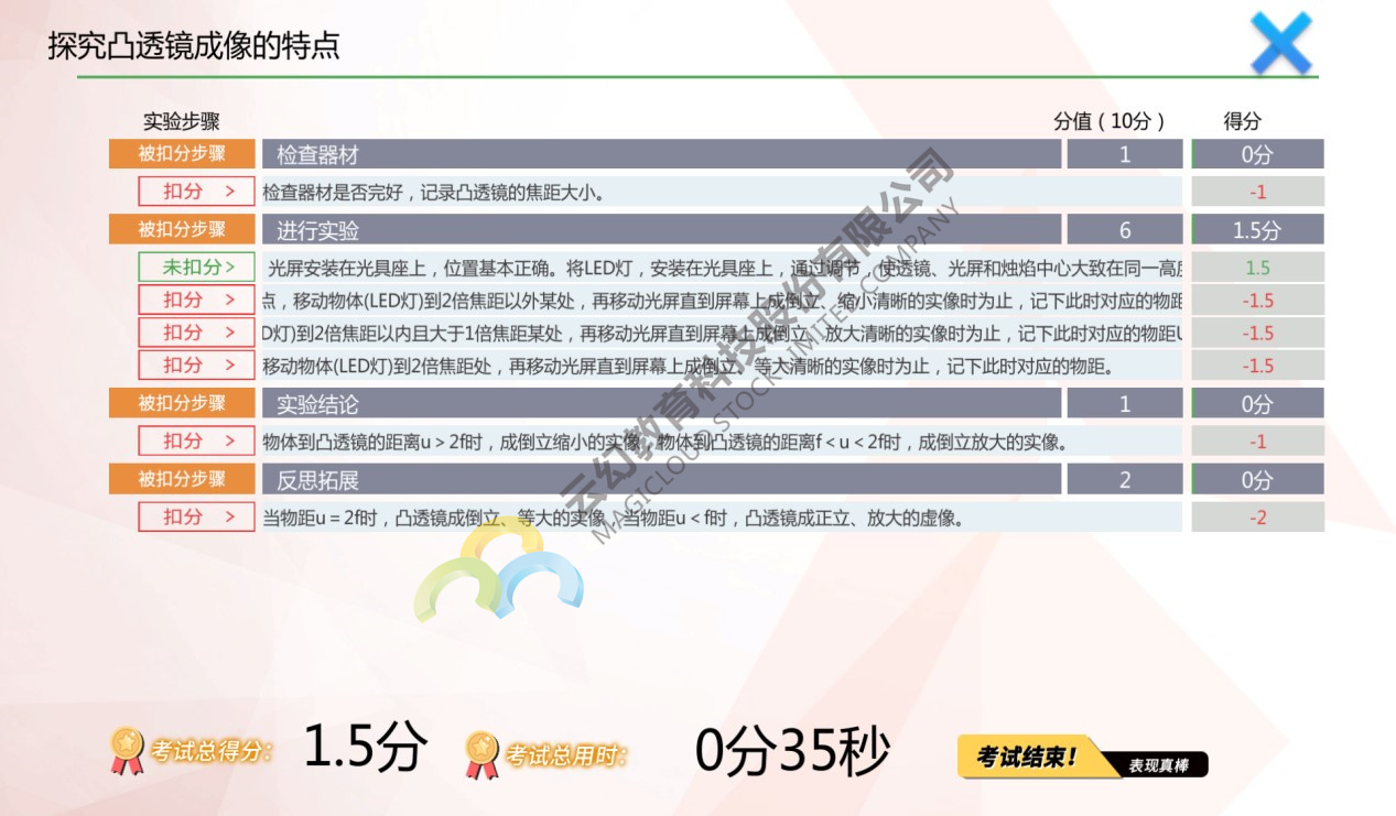 系統記錄學生實驗操作的每一步驟,實驗結束一鍵評分。學生可以通過實驗結果查看錯誤步驟和失分點,不斷練習,直至掌握每一實驗步驟和知識點。