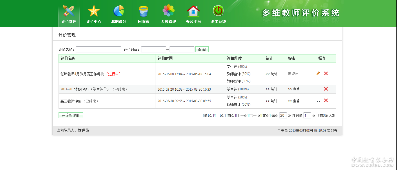 產(chǎn)品詳細介紹教師專業(yè)發(fā)展性評價系統(tǒng)是一套為提高教師的教學(xué)質(zhì)量,反饋學(xué)生的心聲,提高學(xué)校教務(wù)管理能力的系統(tǒng)。針對各專業(yè)所授課程及教師的評價結(jié)果,直觀的統(tǒng)計出每位教師的綜合能力。其中包含領(lǐng)導(dǎo)評、專家評、教師互評、學(xué)生評、家長評五維一體的評價系統(tǒng),并支持去掉最高比例與最低比例值后的最終數(shù)據(jù),真正做到公平、公正、公開。 |