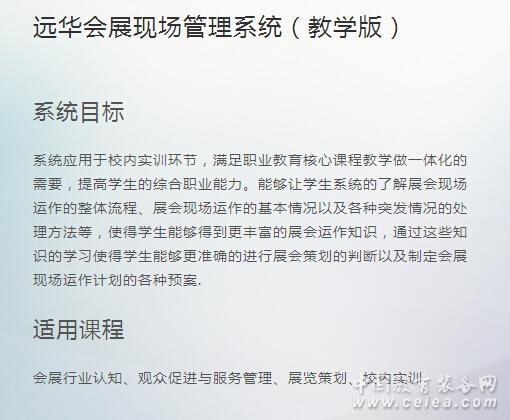 產(chǎn)品詳細(xì)介紹系統(tǒng)目標(biāo) 系統(tǒng)應(yīng)用于校內(nèi)實(shí)訓(xùn)環(huán)節(jié),滿足職業(yè)教育核心課程教學(xué)做一體化的需要,提高學(xué)生的綜合職業(yè)能力。能夠讓學(xué)生系統(tǒng)的了解展會(huì)現(xiàn)場(chǎng)運(yùn)作的整體流程、展會(huì)現(xiàn)場(chǎng)運(yùn)作的基本情況以及各種突發(fā)情況的處理方法等,使得學(xué)生能夠得到更豐富的展會(huì)運(yùn)作知識(shí),通過這些知識(shí)的學(xué)習(xí)使得學(xué)生能夠更準(zhǔn)確的進(jìn)行展會(huì)策劃的判斷以及制定會(huì)展現(xiàn)場(chǎng)運(yùn)作計(jì)劃的各種預(yù)案.