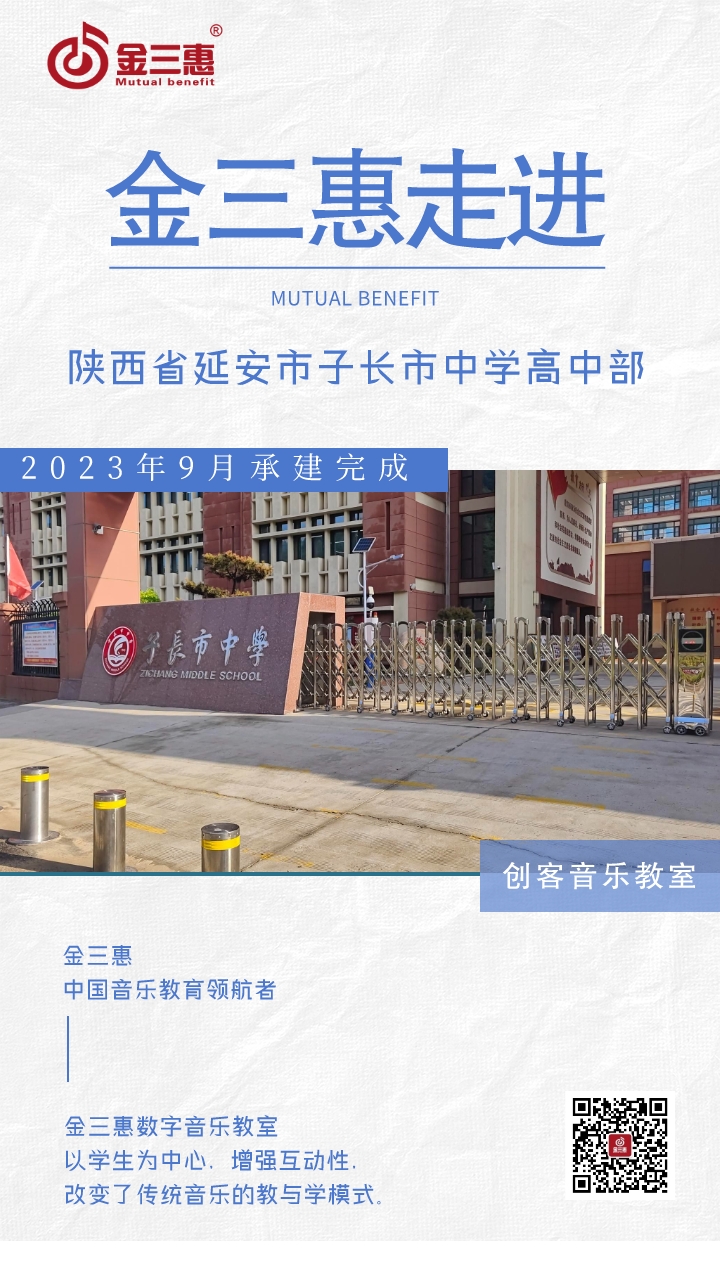 2023年9月,金三惠數字音樂教室為陜西省延安市子長市中學高中部提供、安裝、培訓的32+1智慧創客音樂教室(2套)正式開始使用!配備了金三惠教學系統、電鋼琴、數字音樂教學儀等教學教具。