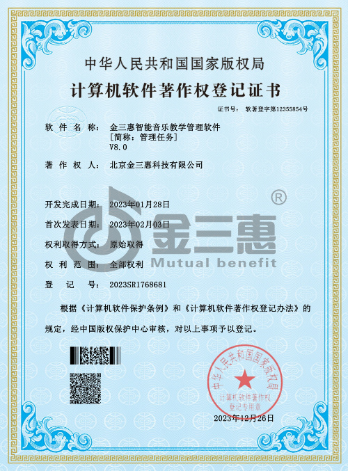 金三惠智能音樂教學管理軟件V8.0 軟著登記證書