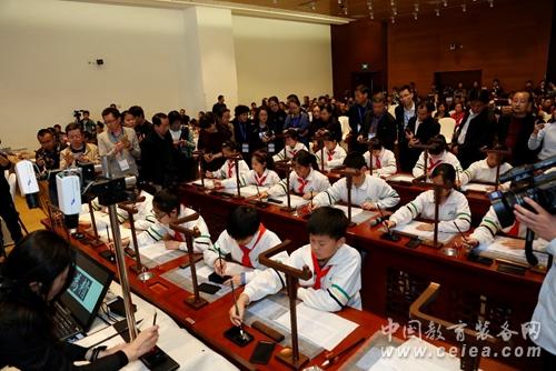 會上,北京天壇東里小學(xué)的老師和同學(xué)們使用北京華文眾合科技有限公司開發(fā)的“智云+”數(shù)字書法教室,使用傳統(tǒng)的筆墨紙硯,結(jié)合信息化技術(shù),通過示范、互動、講評、臨摹練習(xí),為大家展示了一堂別開生面的書法課。