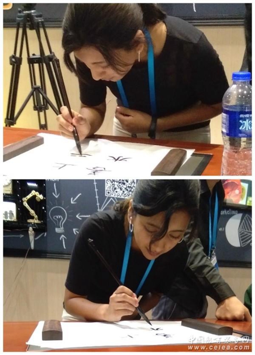 有了華文眾合交互式臨摹臺,外國友人也能立即上手寫出書法作品。